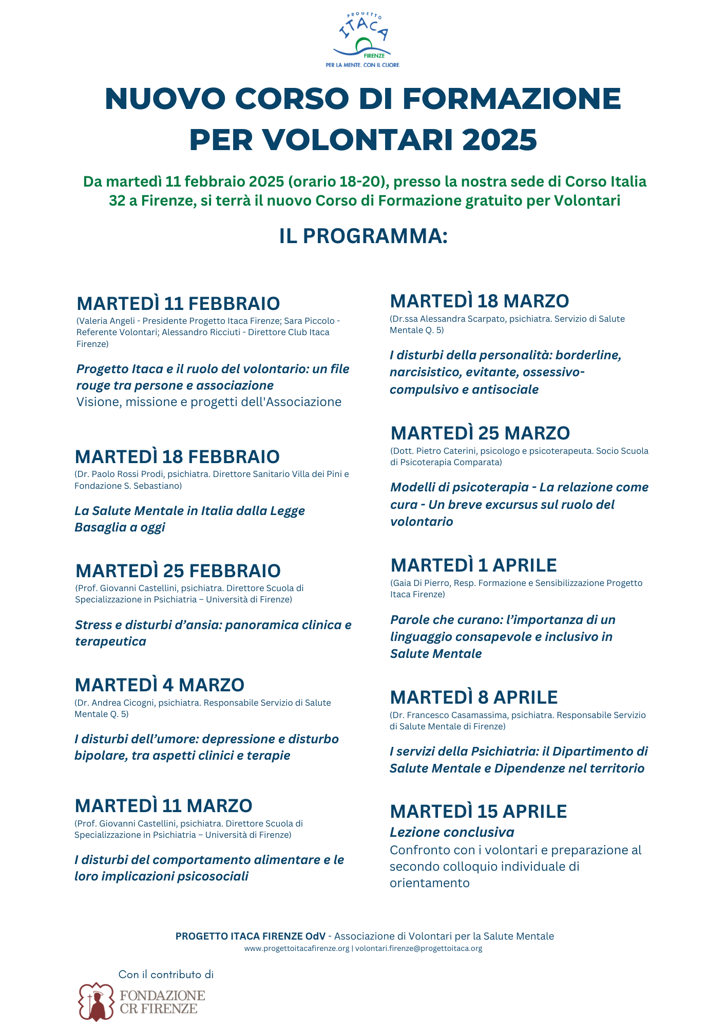 Per questo, offriamo a tutti i futuri volontari un Corso di Formazione gratuito, guidato da psichiatri ed esperti del settore, volto a sensibilizzare e diffondere consapevolezza sui temi della Salute Mentale e a fornire le competenze adeguate per la gestione e l’organizzazione di eventi di sensibilizzazione e raccolta fondi, di attività di prevenzione nelle scuole e di tutte le altre iniziative finalizzate a combattere lo stigma e promuovere la prevenzione.